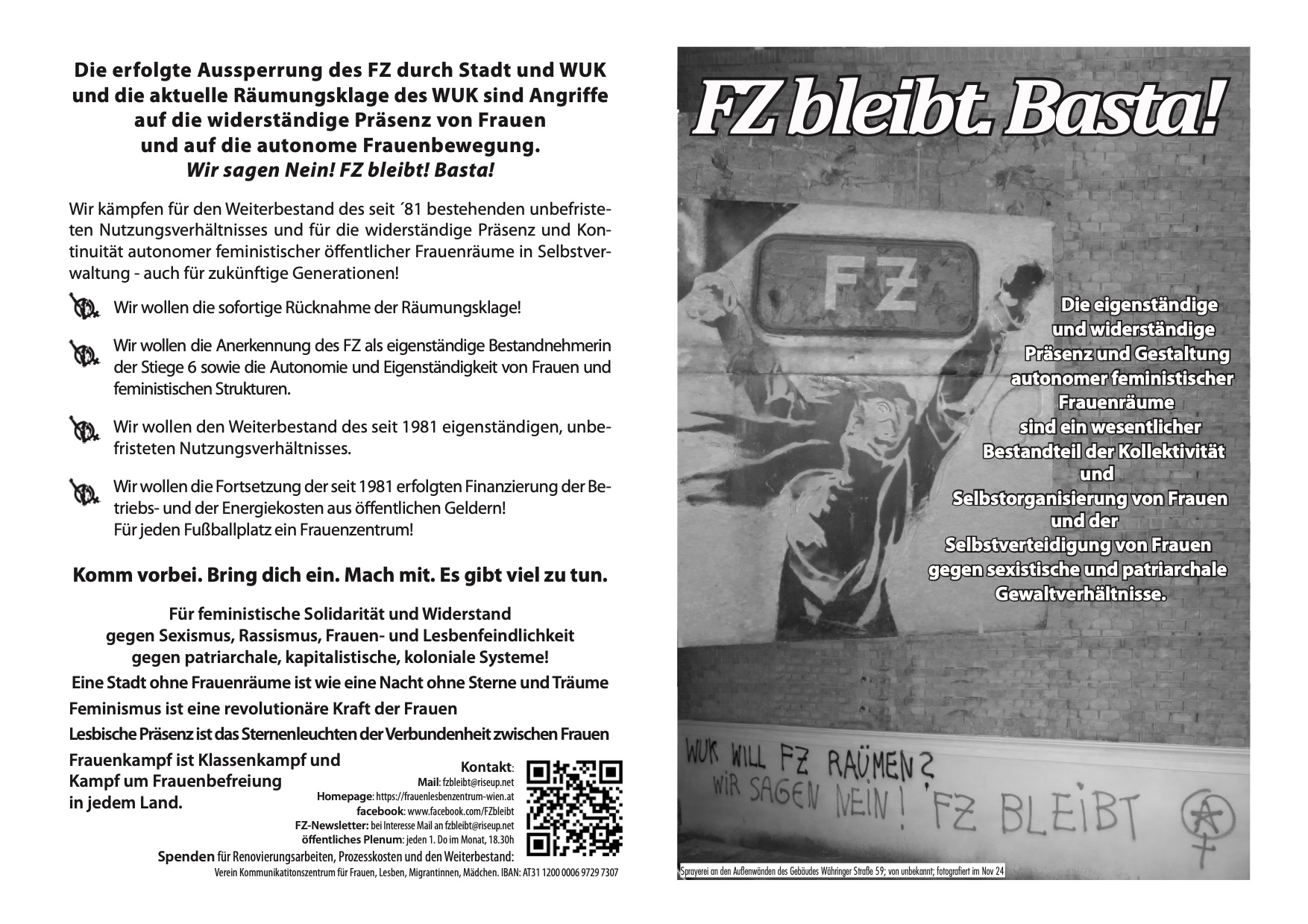 | Offener Brief des FZ an den WUK-Vorstand, Jänner 2023 | Flyer 13.4.2023: FZ Protest: FZ will remain…!, english version Please send your protests to all the responsible persons in Vienna! |