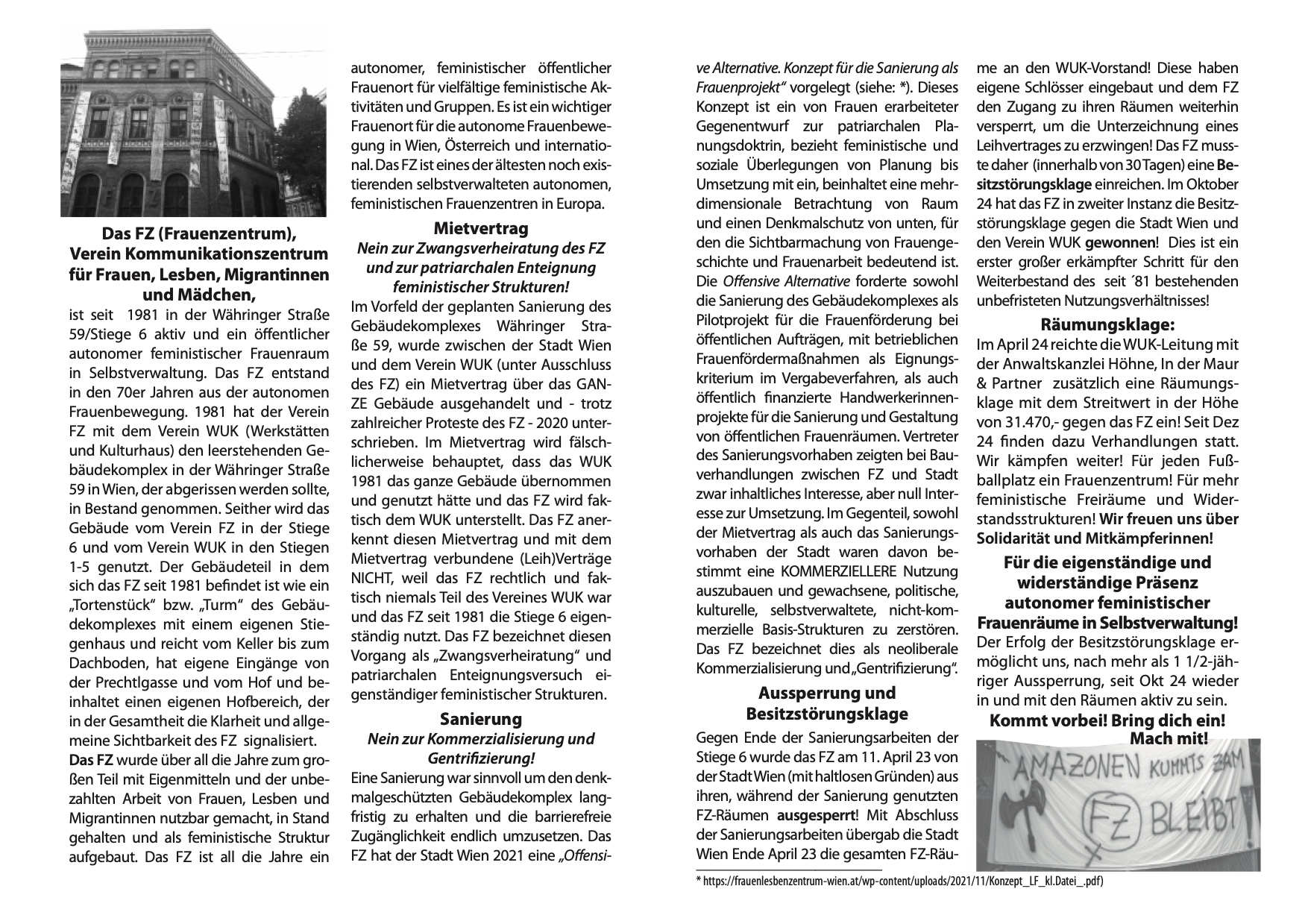 | WienTV: Wiener Frauenstadträtin Gaál lässt Frauen von der Polizei abführen * die Video Langfassung mit erschreckenden Bildern derselben Räumung | Flugblatt FZ bleibt, Jänner 2023 (webansicht) Flugblatt FZ bleibt!, Jänner 2023 pdf |